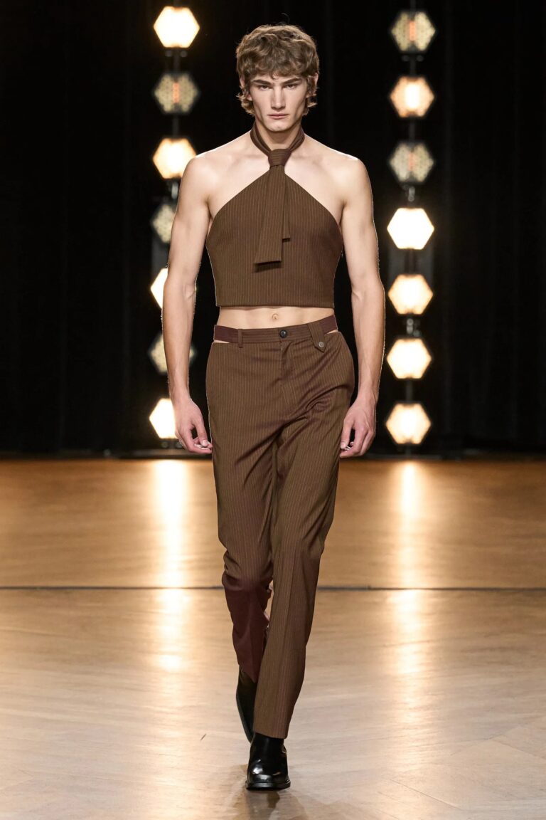 Le retour le plus notable est celui du pantalon taille très basse. Courrèges le réinvente avec des lignes épurées et des finitions impeccables, Doublet propose des versions audacieuses avec des motifs excentriques et des coupes asymétriques, et Acne Studios mélange l’esthétique taille basse avec des influences sportswear et des matériaux techniques.